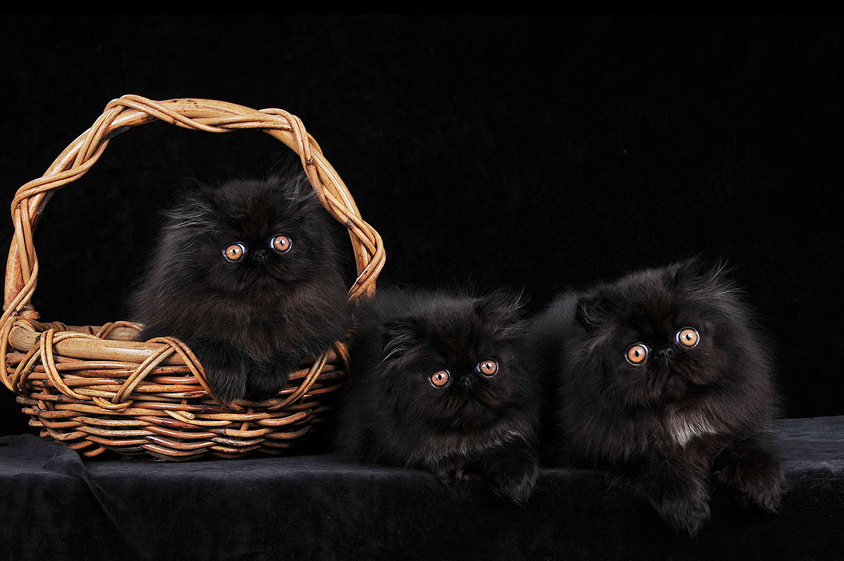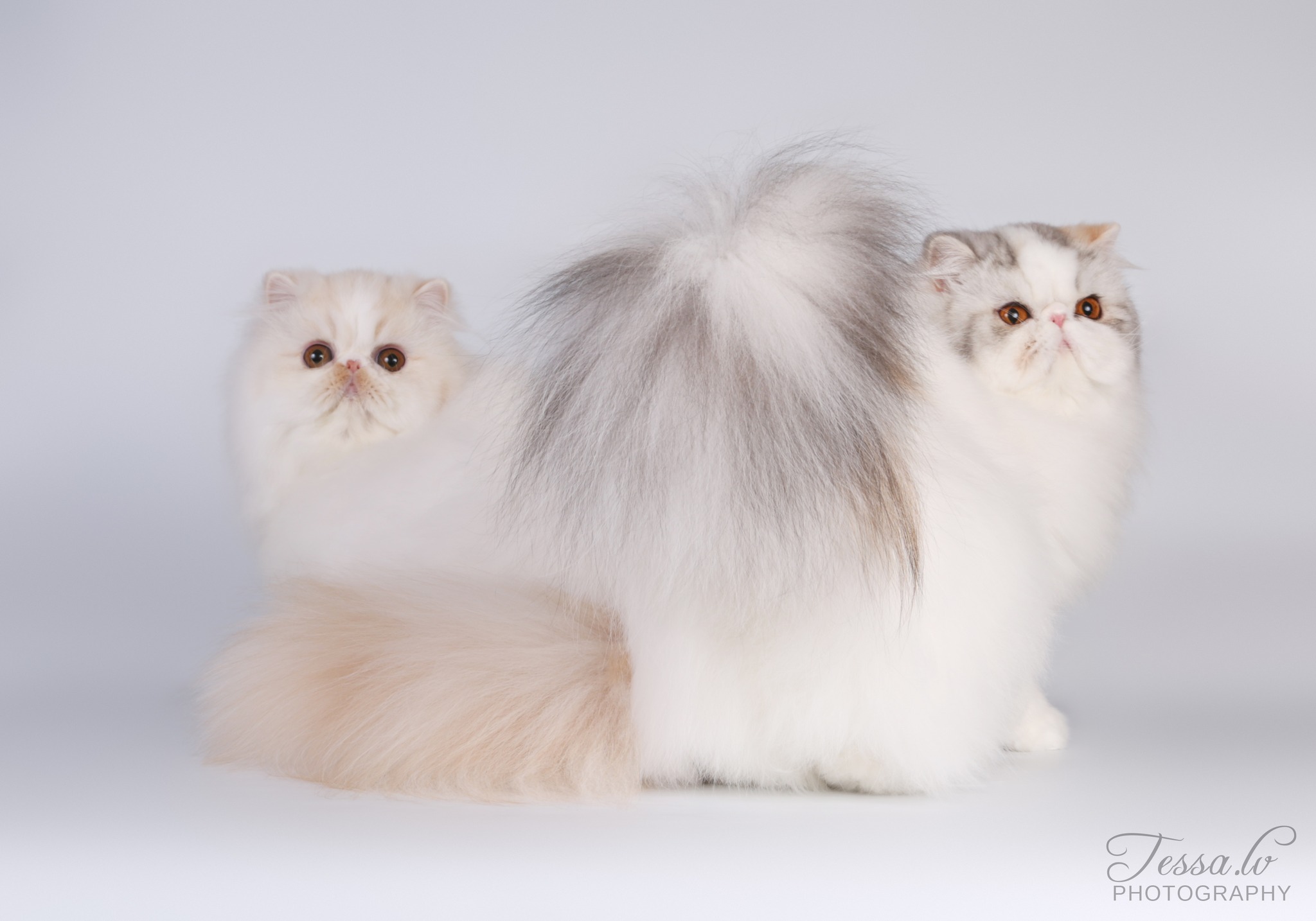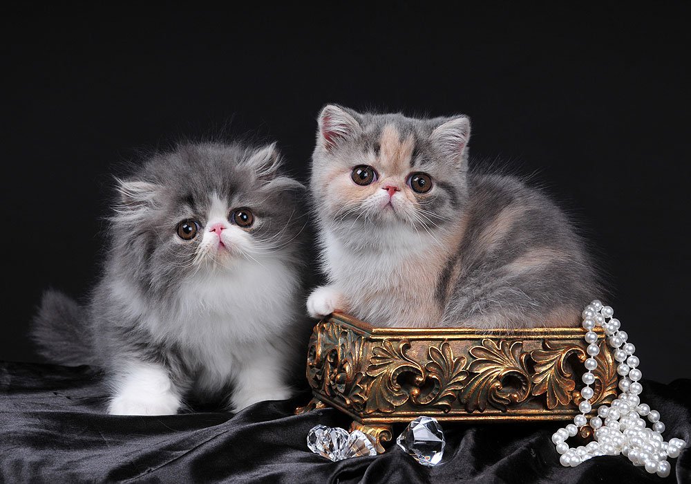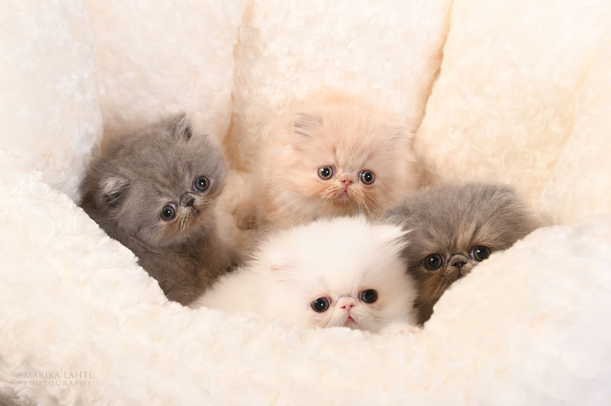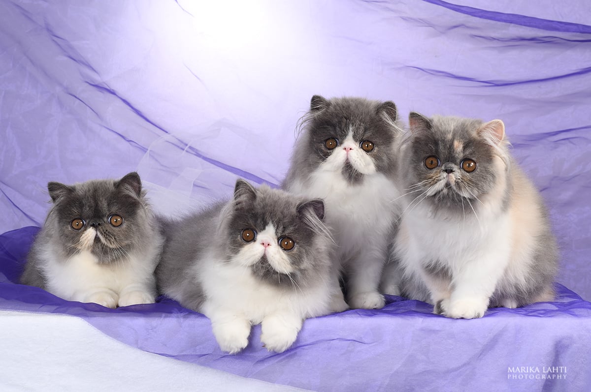 Exotic ja persialaiskissat Himalayan (naamiot), yksiväriset ja tabbyt.