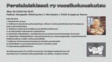 Ajankohtaista Tervetuloa sääntömääräiseen kevätkokoukseen 18.3.2026 kello 18.30! By Maarit Peltomo 27 helmikuun, 2026 27 helmikuun, 2026 Ilmottaudu viimeistään 15.3.: Sari@persialaiskissat.net Osallistu joko Kuopiossa tai Teamsin kautta etänä. Sääntömääräinen syyskokous keskiviikkona 26.11.2025 klo 18.00